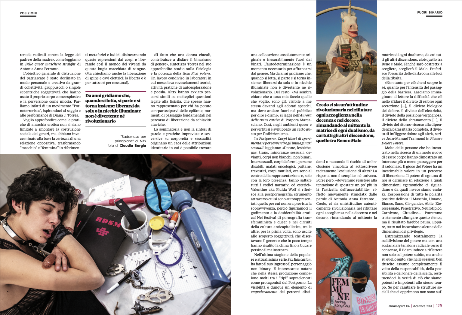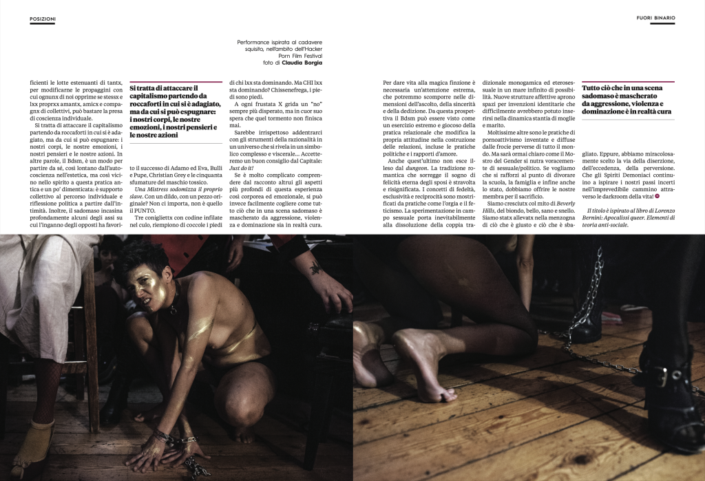 DinamoPress è un progetto di informazione indipendente nato nel 2012 dalla collaborazione tra attivistə, ricercatorə, giornalistə, militantə di movimenti sociali e studenteschi, ricercatorə universitarə e videomaker. Nel numero 04 della rivista cartacea dal titolo “Transizioni, città e corpi fuori norma” – alcune mi immagini accompagnano l’articolo di Nitx “Queer dell’Apocalisse e pratiche politiche dell’osceno”.